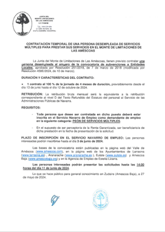 La Junta del Monte Limitaciones de Las Améscoas, tiene previsto contratar una persona desempleada al amparo de la convocatoria de subvenciones a Entidades Locales...Más información